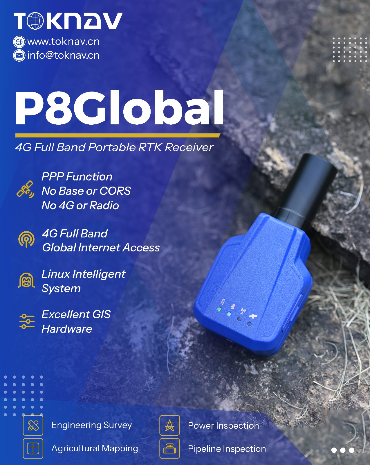 The P8Global is a portable intelligent positioning terminal with IMU function, developed based on BDS high-precision positioning technology. The main unit is lightweight and compact, making it easy to carry around. With special function PPP, it also supports tracking of signals from all satellite constellations with 1408 channels, providing centimeter-level positioning accuracy. It caters to various measurement and layout tasks such as road construction, power line surveying, site leveling control, CAD applications, railway stakeout, and more.